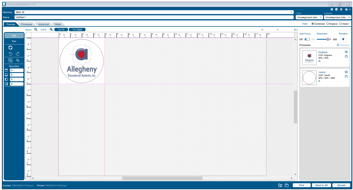 Epilog Dashboard – Artwork Appears Off the Bed When Printed