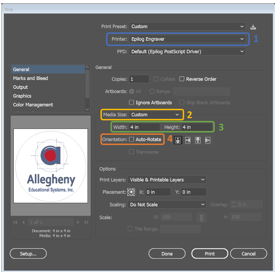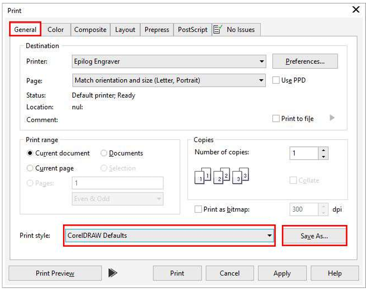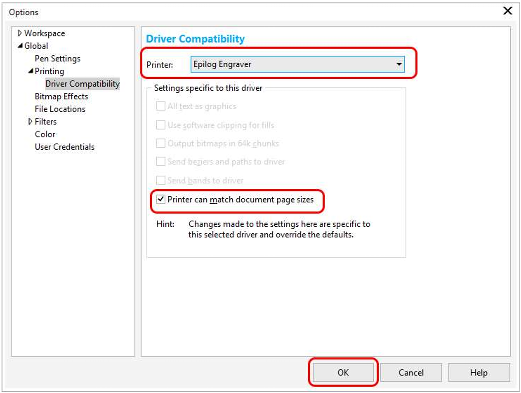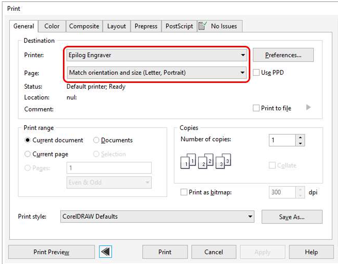 When printing from CorelDRAW or Adobe Illustrator to the Epilog Dashboard, your artwork may appear outside the engraving area and need to be dragged onto the bed. This happens when the document or artboard size doesn’t match the printer/page settings.